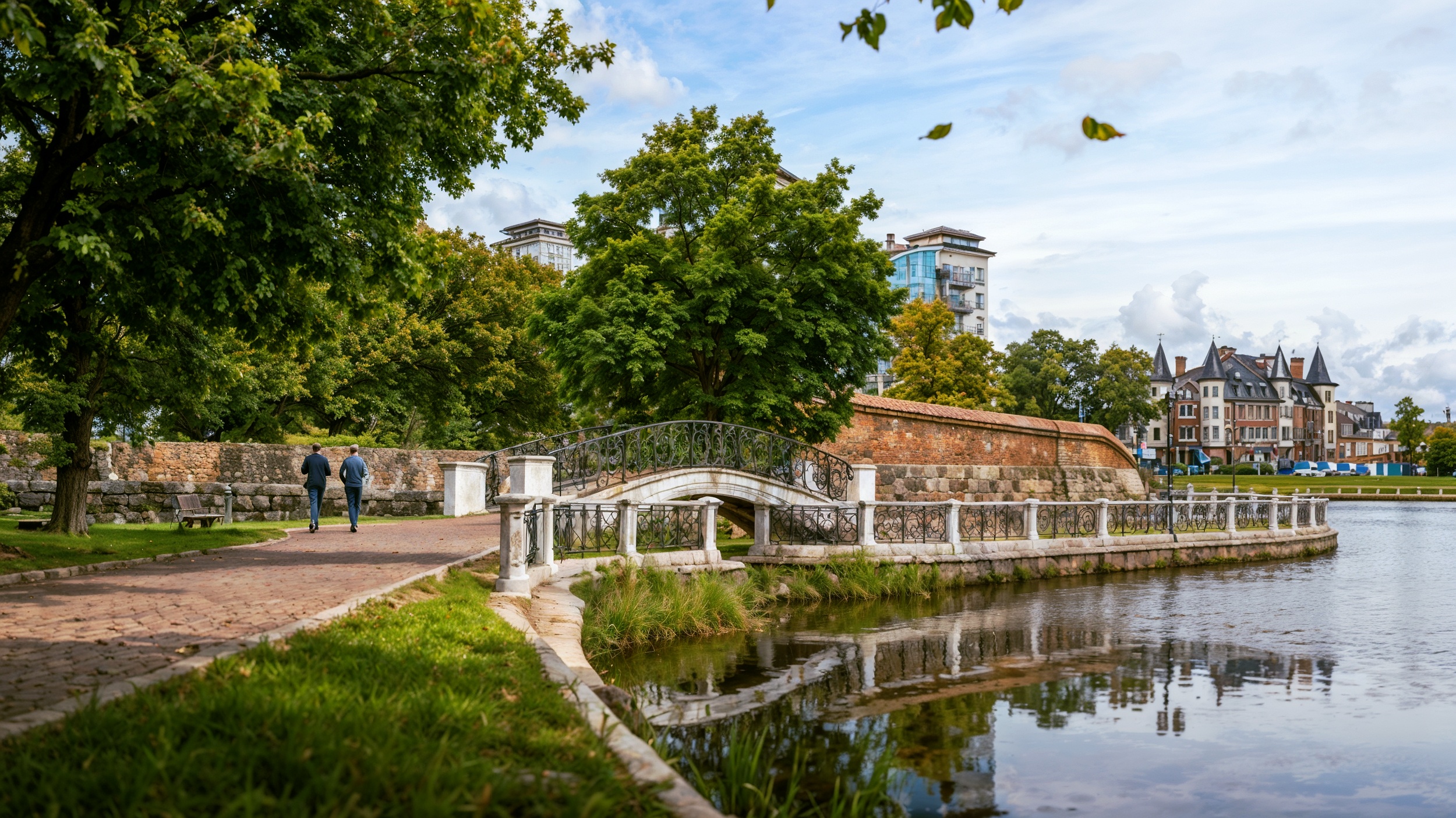 Променад вдоль западного берега защищён от ветра густой растительностью, способствующей звукоизоляции. В ясный день зеркало пруда отражает башенки старых вилл — получается настоящий insta-фон.