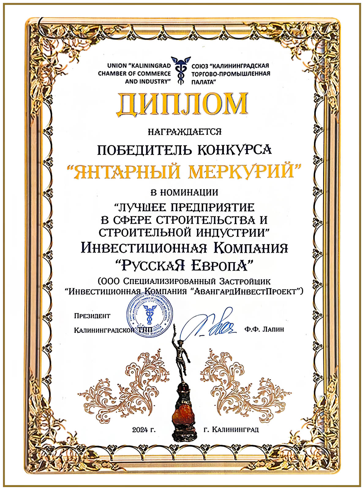По общему признанию, застройщик “АвангардИнвестПроект” в лице директора Ярошенко Александра Ивановича, стал лауреатом «Янтарного Меркурия » в номинации: “лучшее предприятие в сфере строительства и строительной индустрии”
