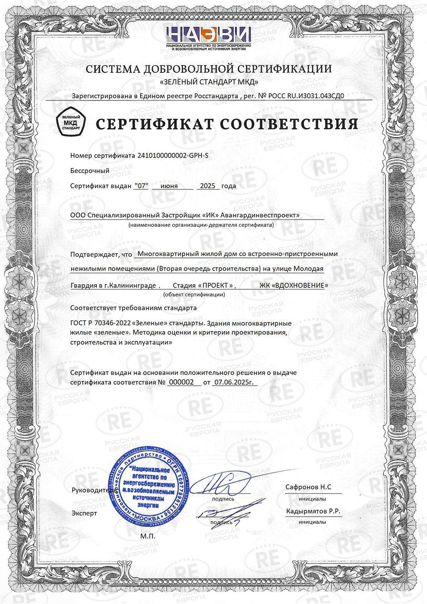 Вторая очередь строительства ЭКОквартала «Русская Европа», жилой комплекс «Вдохновение» в Калининграде стал первым объектом региона, удостоенным престижного сертификата соответствия по системе добровольной сертификации «Зелёный стандарт МКД»