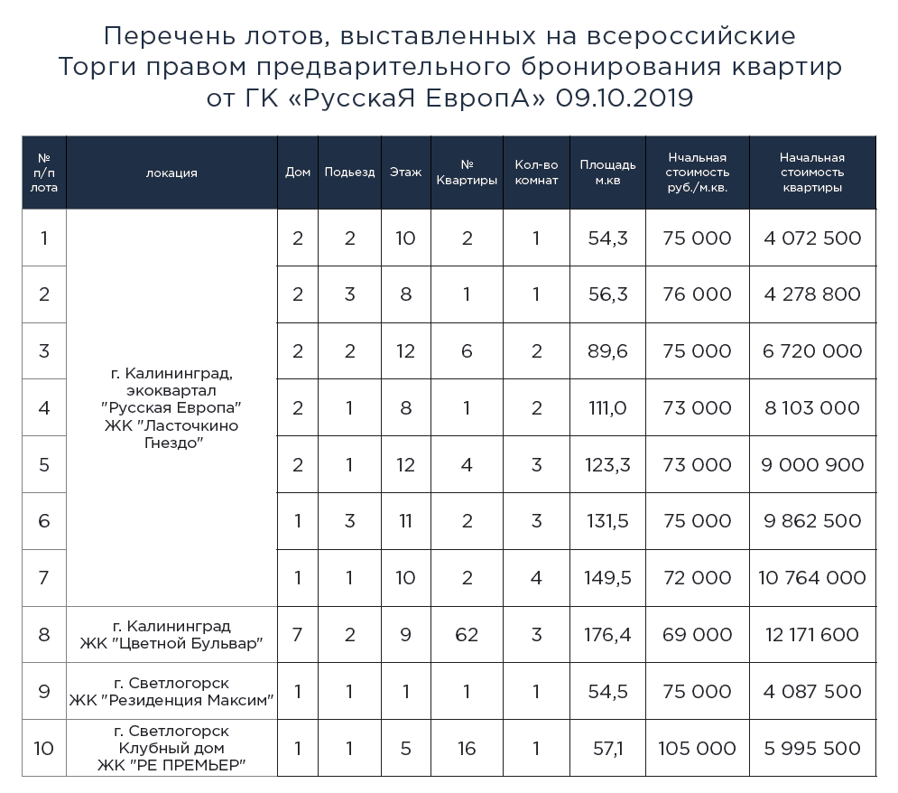 Всероссийские Торги правом предварительного бронирования квартир от Группы Компаний «РусскаЯ ЕвропА».